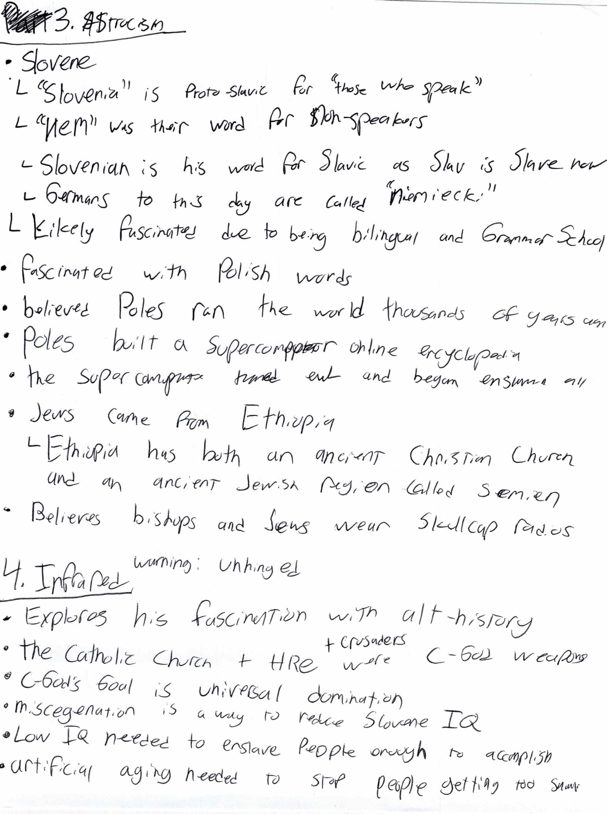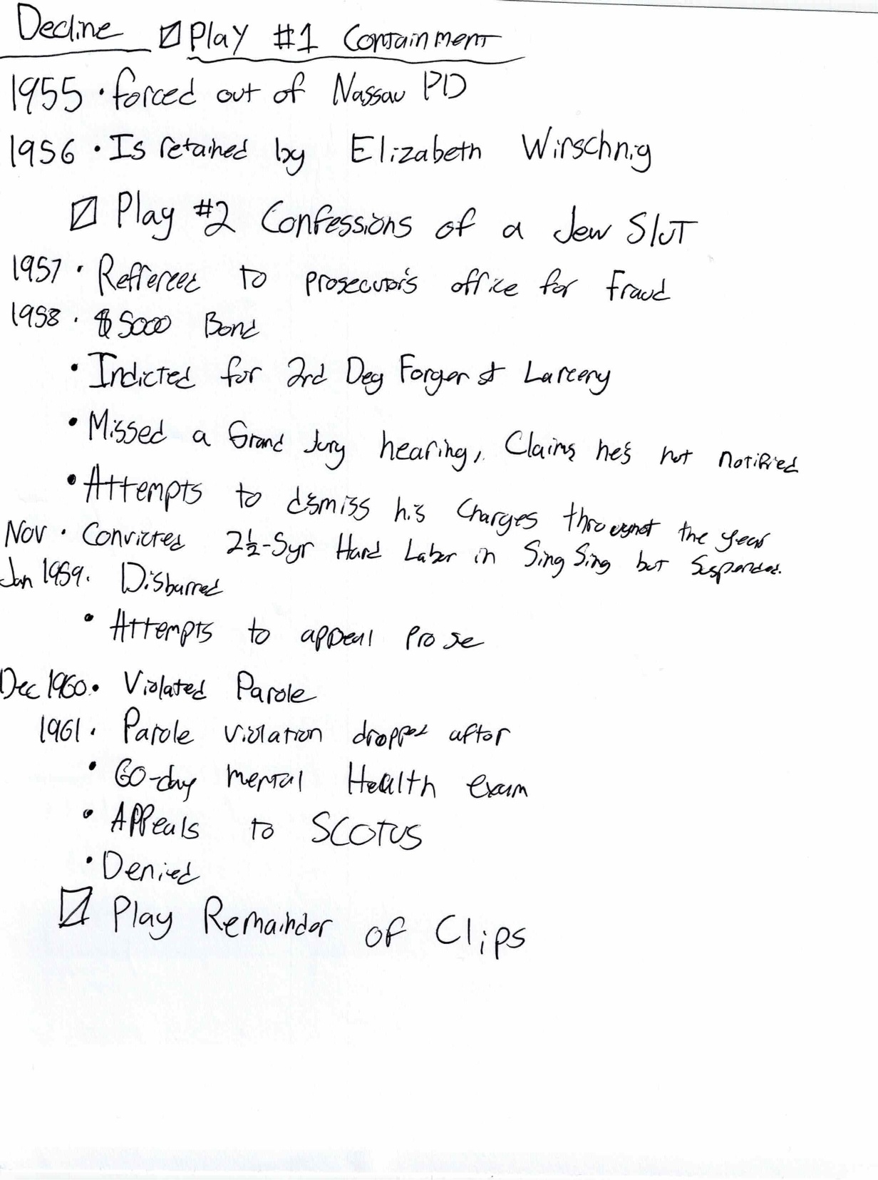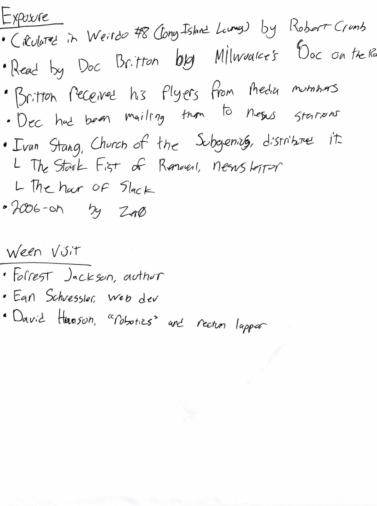 TO ALL LISTENERS: BELOW ARE THE HAND-WRITTEN SCANNED DOCUMENTS I PREPARED IN ADVANCE FOR MY STREAM ON HALLOWEEN DAY. ONE OF THE BEST THINGS I LEARNED FROM BRIEFLY WORKING A "REAL JOB" WAS TO WRITE (NOT TYPE) NOTES BECAUSE YOU RECORD THAT INFORMATION TO COMPLETELY DIFFERENT PARTS OF YOUR BRAIN IN DUPLICATE THAN BY SIMPLY READING OR HEARING IT. WISELY, I HAVE STUDIOUSLY PREPARED ALL OF MY "SPOTLIGHT" EPISODES USING THIS TECHNIQUE SO AS TO BETTER RECALL IT. JUDGING BY THE STATE OF MY HANDWRITING ONE CAN TELL I DO NOT WRITE VERY OFTEN BUT FOR YOUR AMUSEMENT I WILL SHARE THEM ANYWAYS. MAKE COPIES FOR YOURSELF.